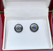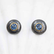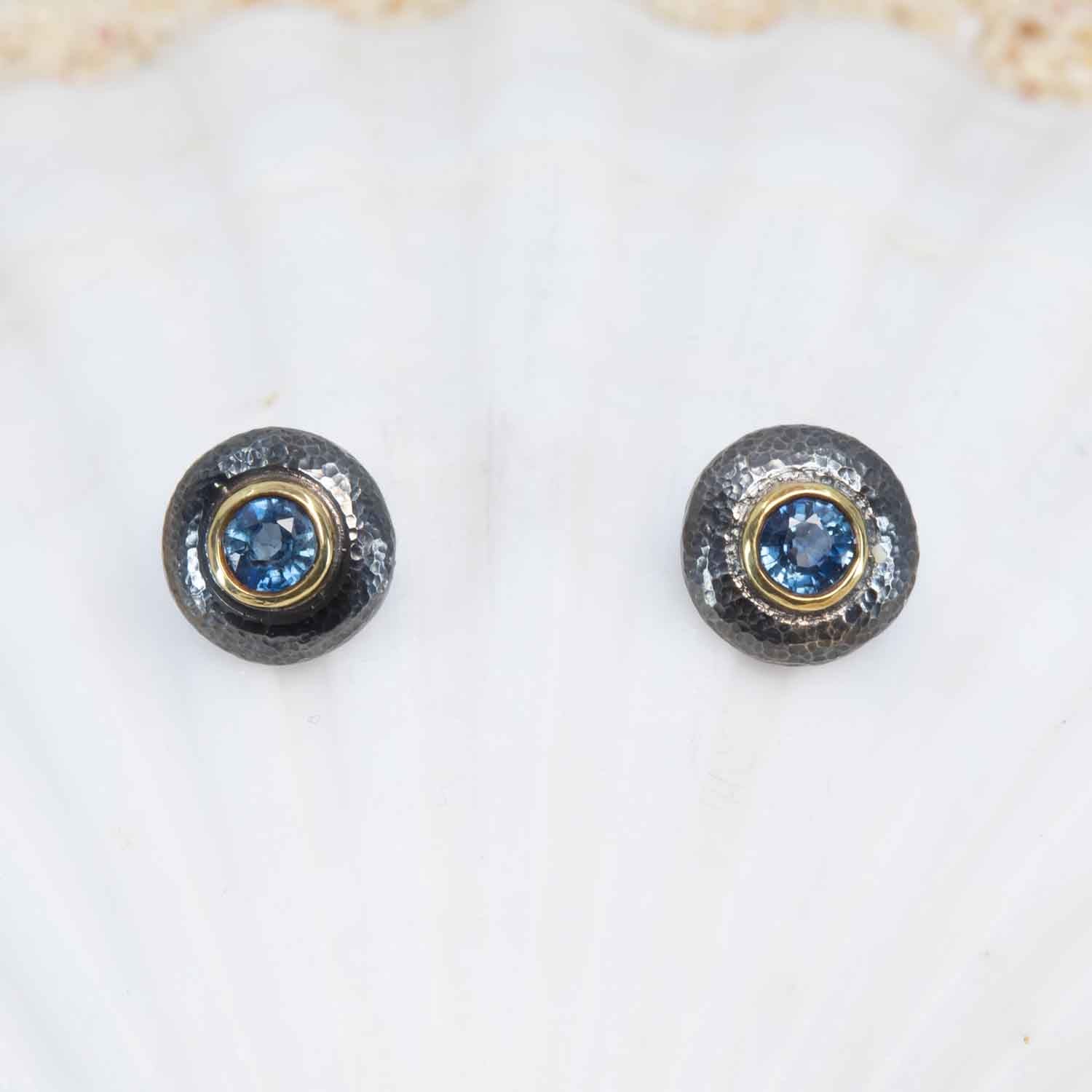 These earrings have been handcrafted in oxidized Sterling Fathoms Silver with a water ripple pattern along with 18K Treasure Gold and set with two beautiful 4.5mm blue sapphires.