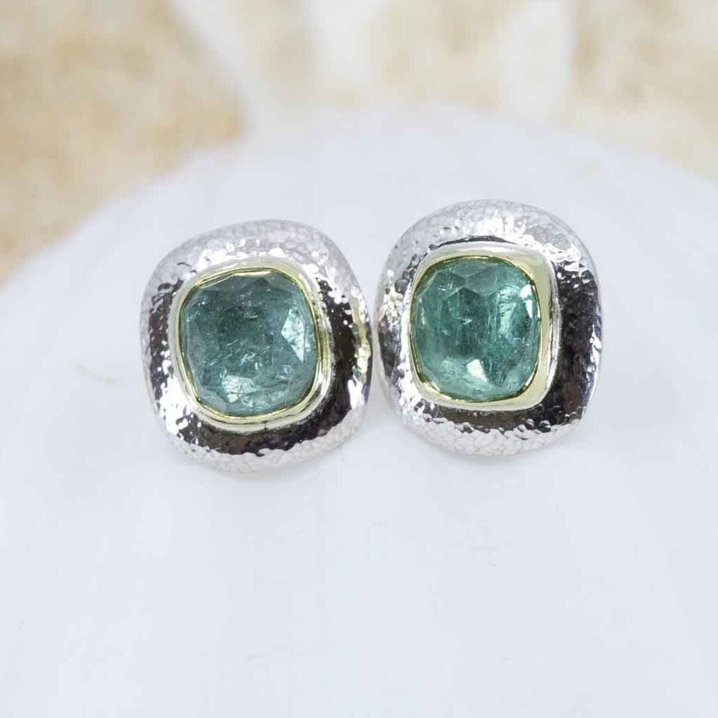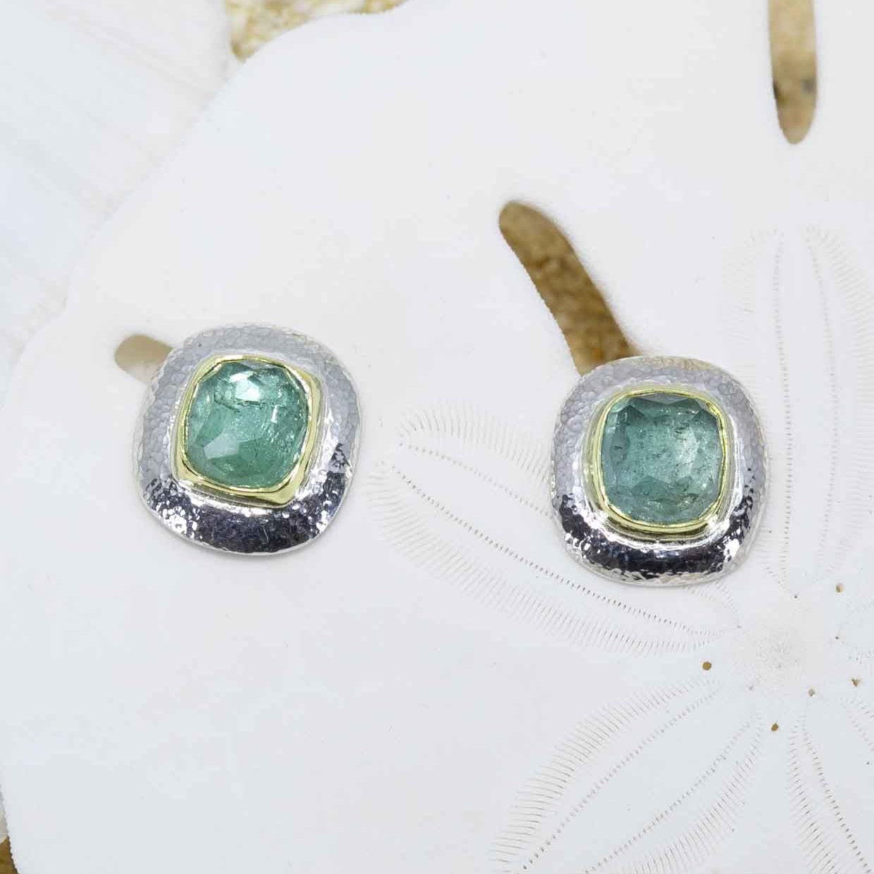 Earrings perfect for a mermaid!  These beautiful earrings have been handcrafted in Sterling Fathoms Silver and 18K Treasure Gold and given a micro Water-Ripple pattern.  Set with two rose-cut Seafoam-green tourmalines weighing 2.44cts.