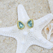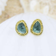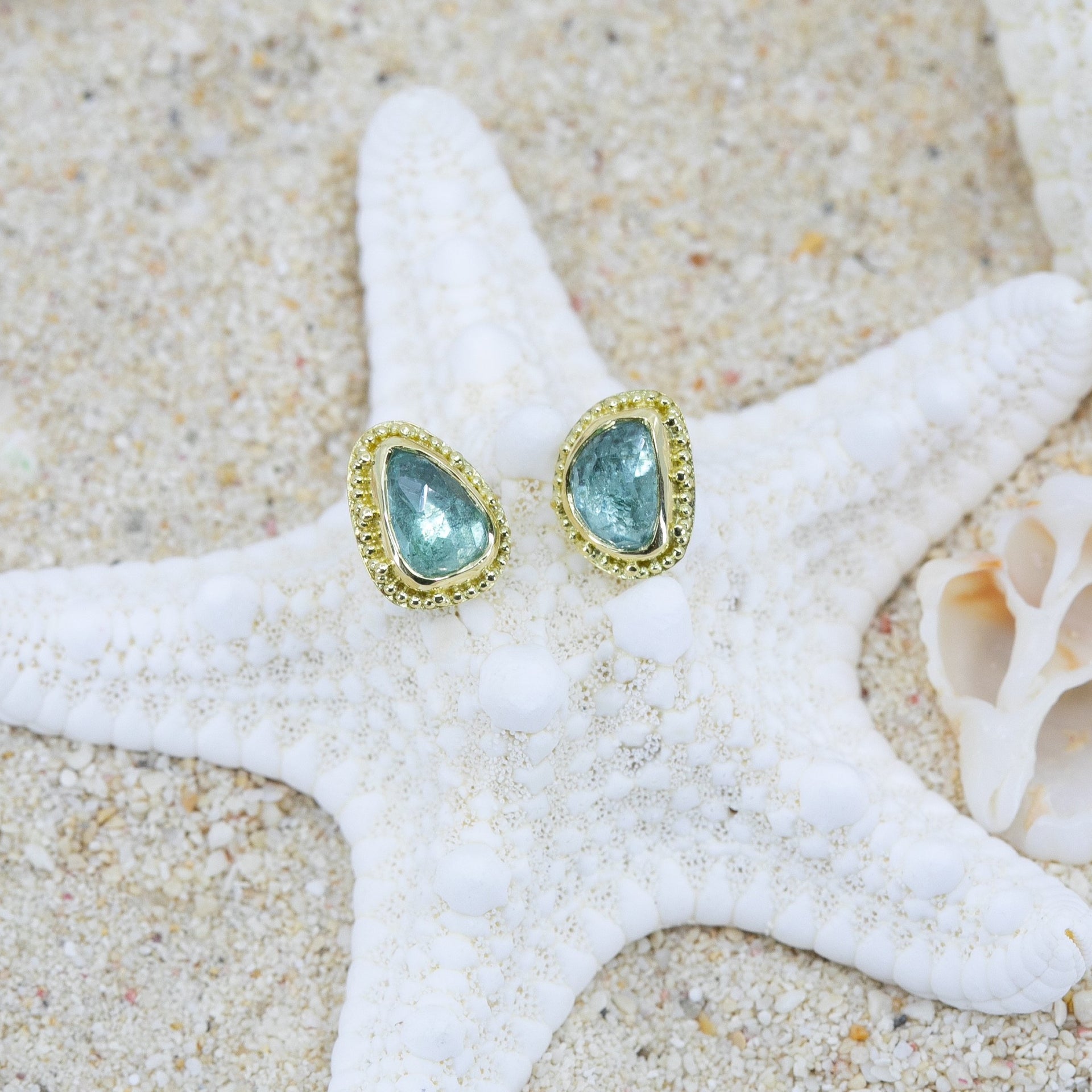 These beautiful and old world-styled studs feature 2 seafoam-green freeform tourmalines in granulated 18K Treasure Gold. These fun and elegant earrings feature unique tourmalines weighing 2.1cts and are crafted in solid 18K gold made with 400 year-old sunken treasure recovered from the Caribbean.