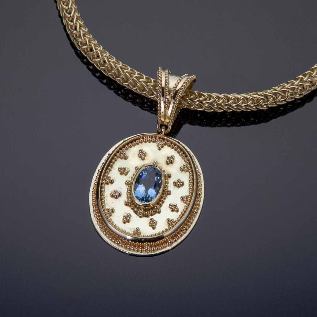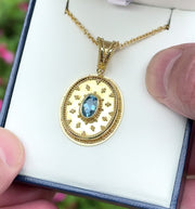 This Aquamarine Granulated Pendant is a fine example of handcrafted jewelry. Meticulously crafted in 18K gold, it features a stunning 1.09ct oval-cut aquamarine and exquisite granulation, making it an eye-catching piece of accessory. A luxurious adornment and timeless statement piece.