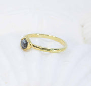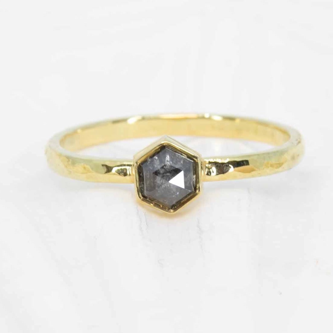 This 18K Treasure Gold ring is set with an 0.51ct hexagonal raw diamond on a 1.8mm wide shimmering water-ripple band. Handcrafted in solid 18K gold made with 400 year-old sunken treasure recovered from the Caribbean. Size is just under 6.75, but each ring comes with free sizing and FREE SHIPPING!
