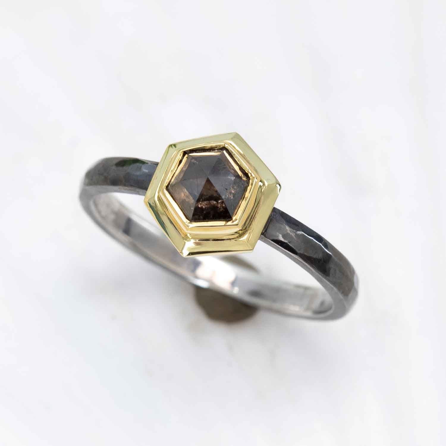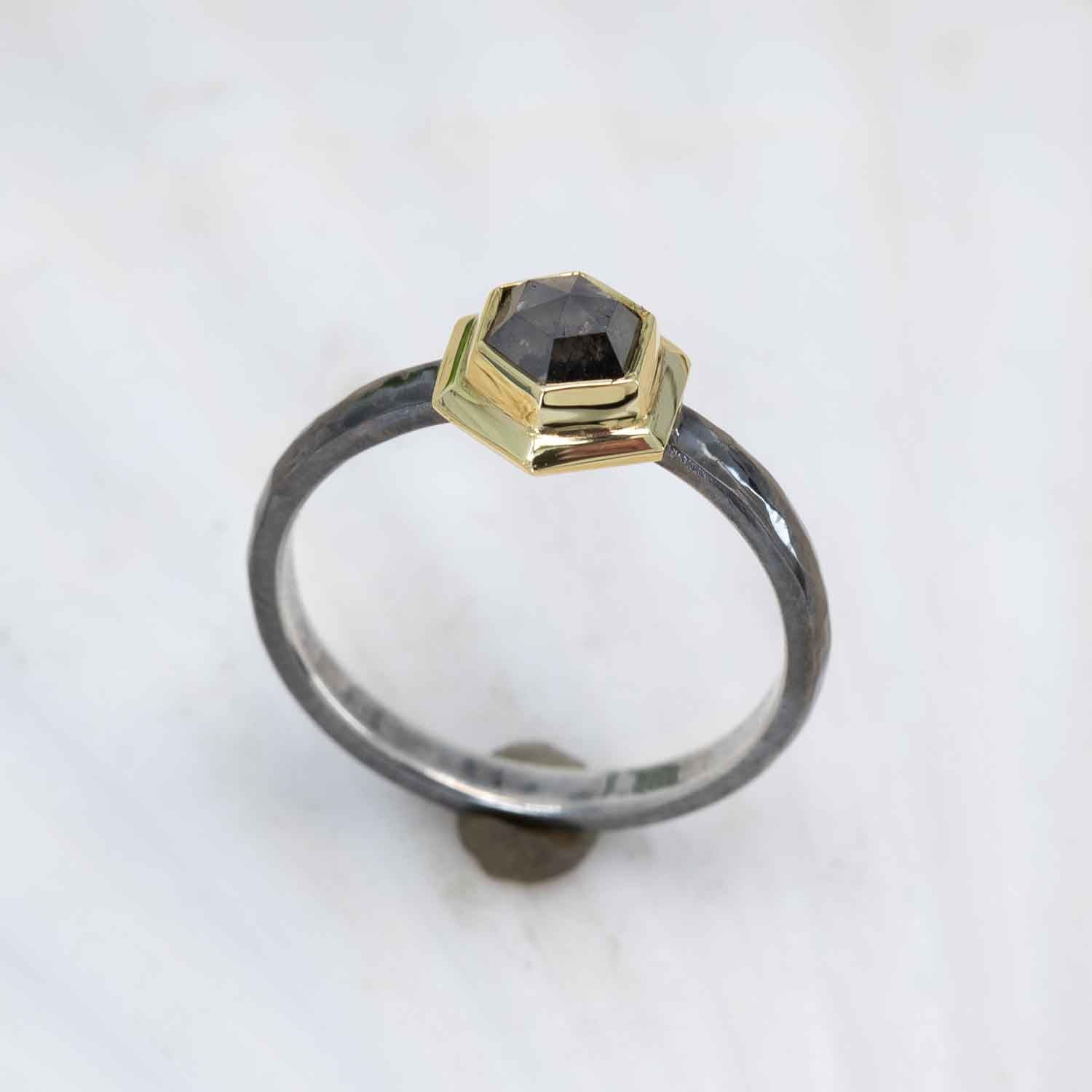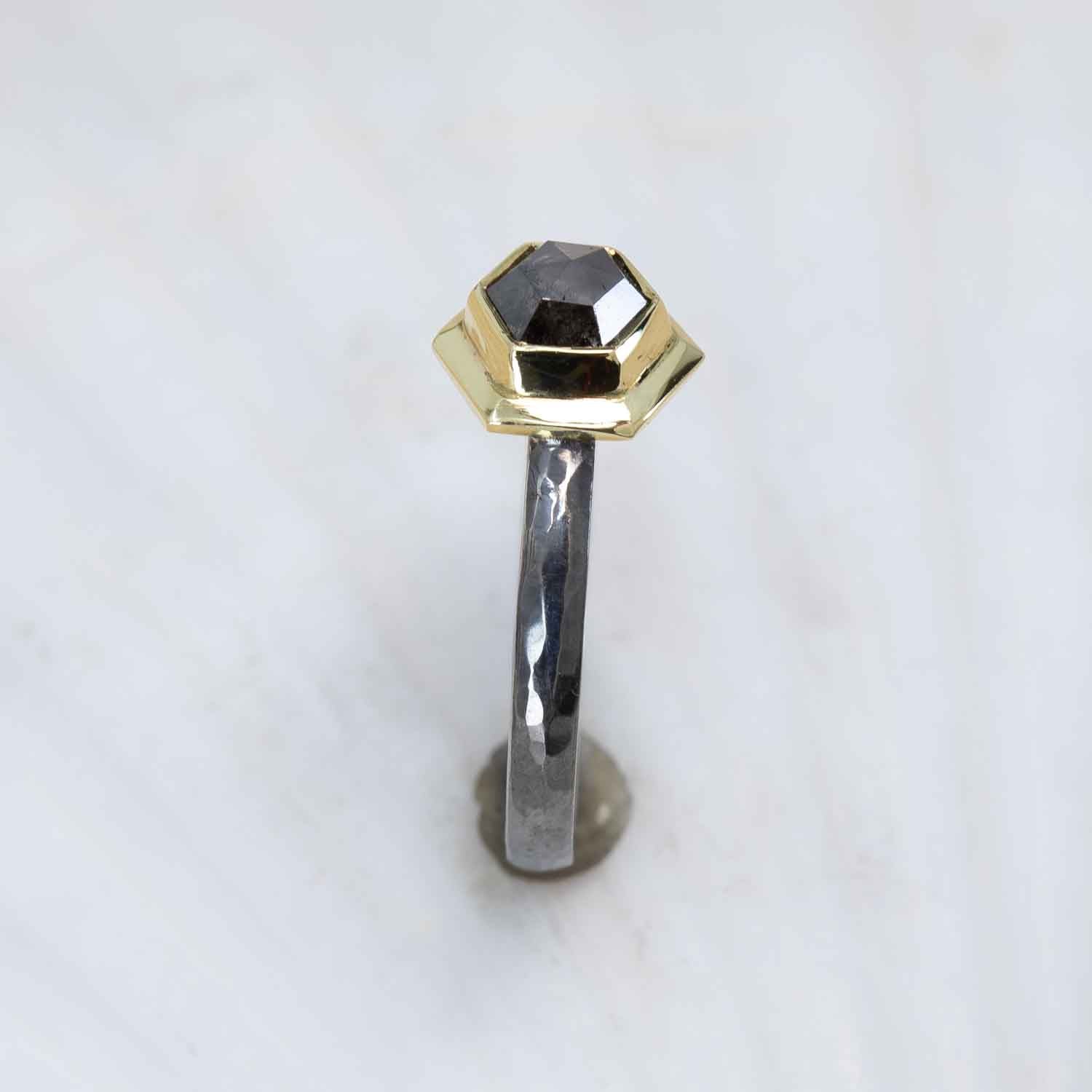 This ring is handcrafted in Sterling Fathoms Silver with a water-ripple band and features a 0.86 Raw Diamond set in 18K Treasure Gold. Size 6.25, but each ring comes with free sizing and FREE SHIPPING!