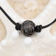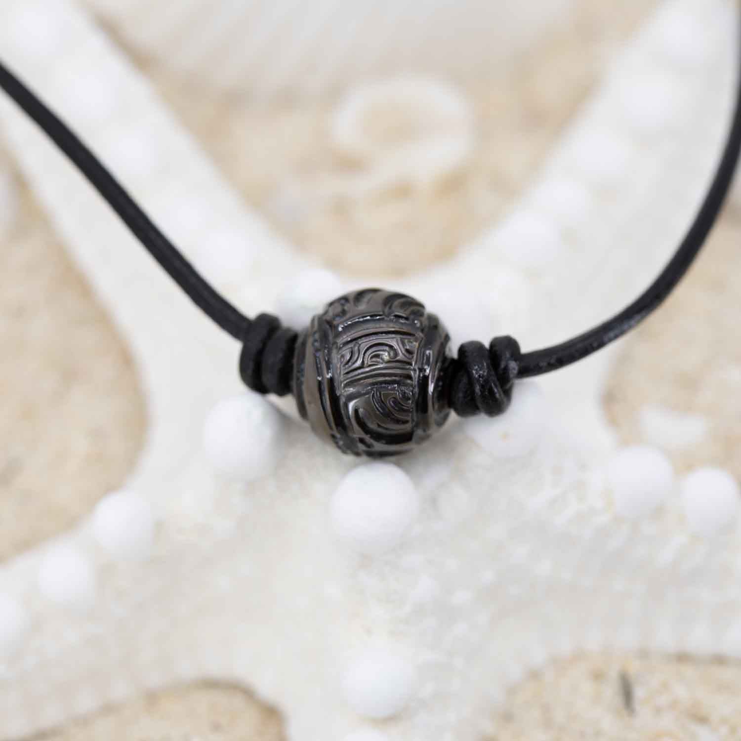 Explore the beauty of the South Pacific with this hand-carved Tahitian Black Pearl Necklace! Each pearl is intricately carved by Tahitian artisans with Polynesian designs, then strung on an adjustable black leather cord for a unique look, daring you to explore your own paradise. Dive in!