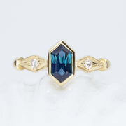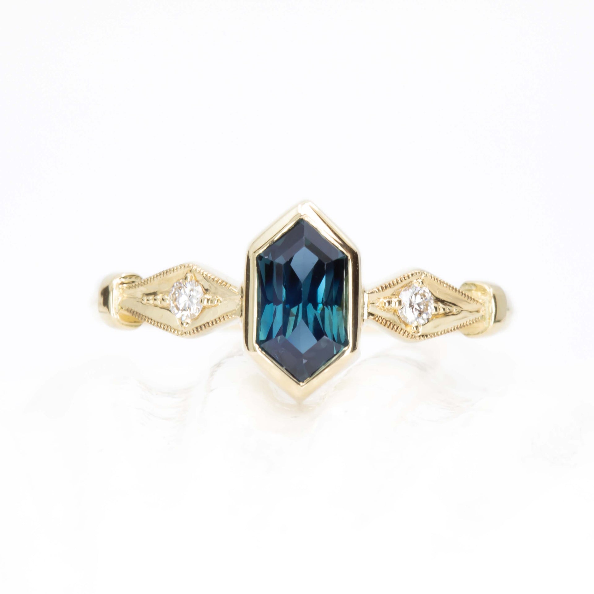 *Note about sapphire color: Sometimes sapphires can be very tricky to photograph as their color will shift depending on the light source (fluorescent, incandescent, LED, natural daylight, etc.). This particular sapphire is one of these. Under fluorescent lighting, this sapphire will taken on more of a darker, denim blue. However, in sunlight or halogen-style lighting, it's blue will shift to a richer and brighter navy-like blue.