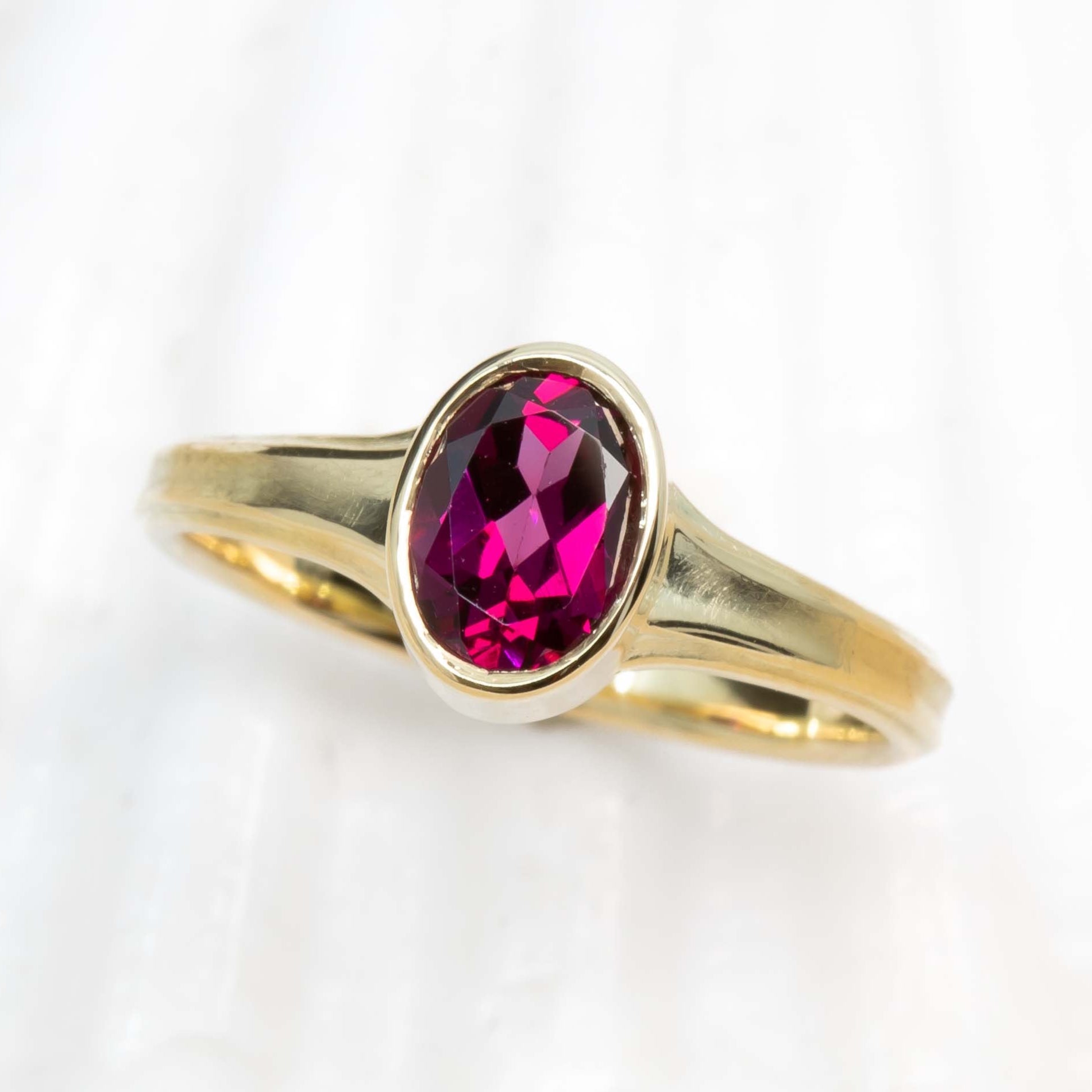 This Atlantis-inspired ring features a beautiful rich, rhodolite garnet weighing approximately 1ct and is a 7x5mm oval. This piece is crafted in 14K gold. It has been given a shipwrecked texture reminiscent of a jewel recovered from the depths after being lost and tumbled in the ocean for centuries.