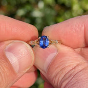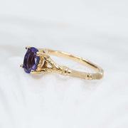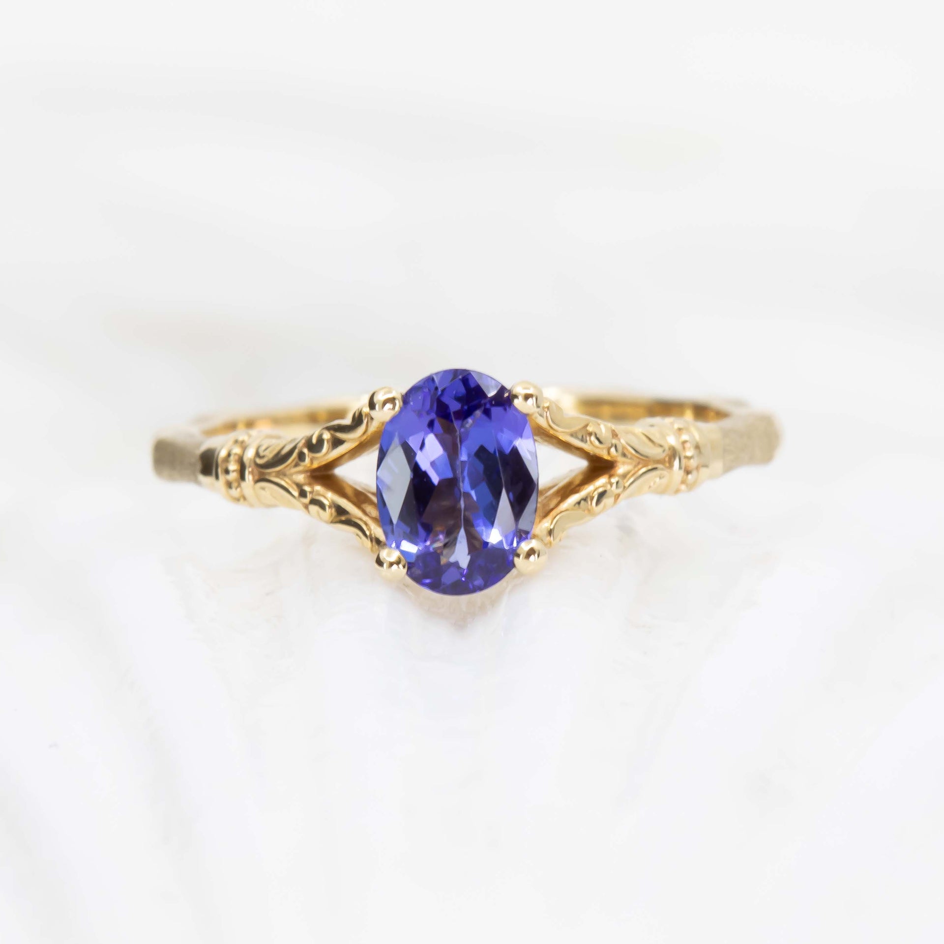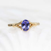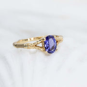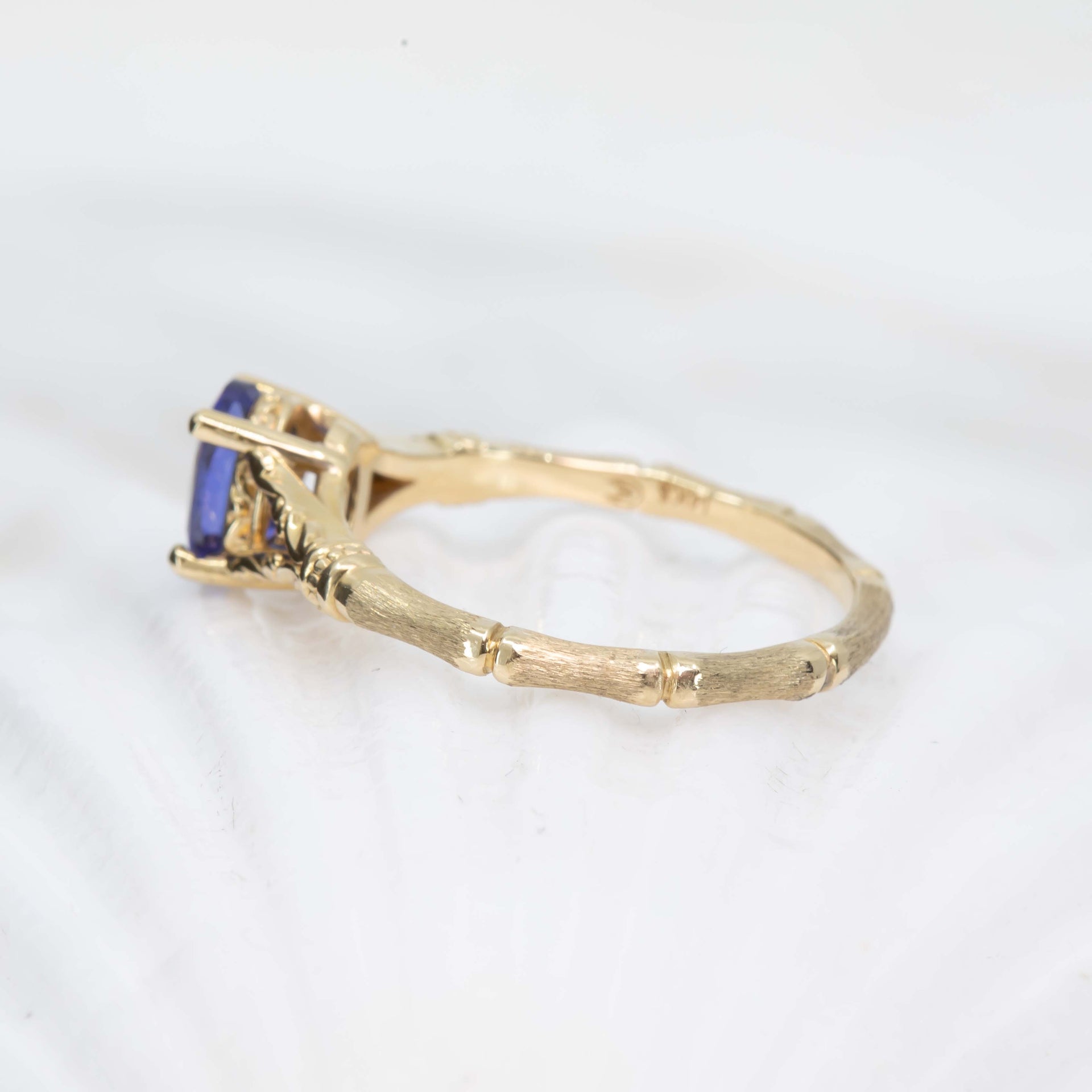 Seven bamboo segments run around the band leading to a center setting with a vintage-vibe holding a velvety 7.5x5.mm (approximately 0.82ct) oval tanzanite.