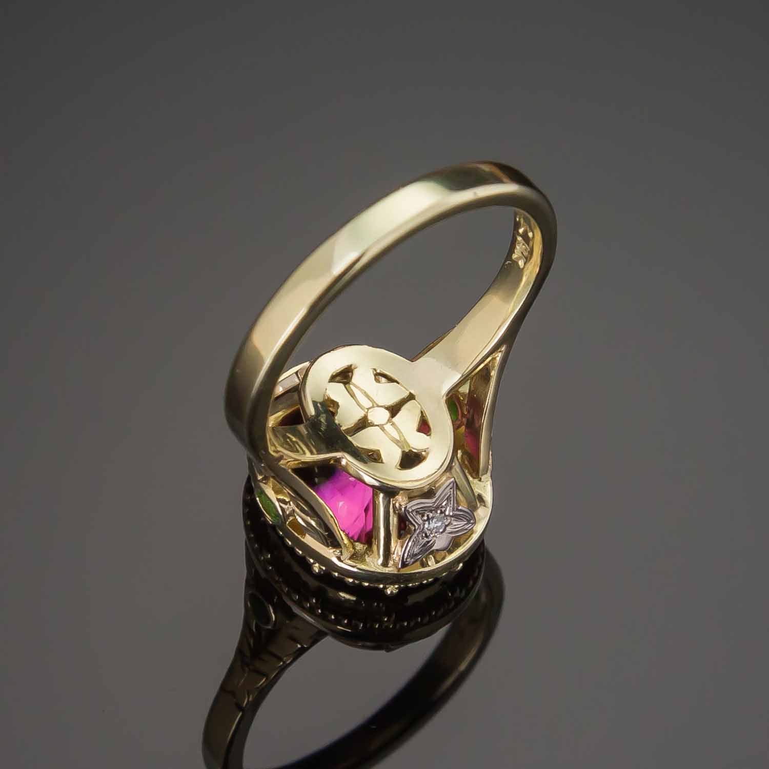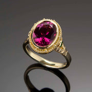 Exquisitely handcrafted in granulated 18KY gold, the “flower” of this one-of-a-kind ring is a 3.13ct rubellite tourmaline. Butterflies created in 18KW and each set with a 1.3mm VS/GH diamond are found on either side of the center gemstone. 2mm tsavorite garnets and the engraved leaf pattern create the flower’s stalk on the shank as engraved butterflies on the shank and beneath the center stone all flutter to the dazzling raspberry-red of the luscious rubellite tourmaline.