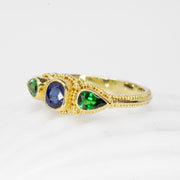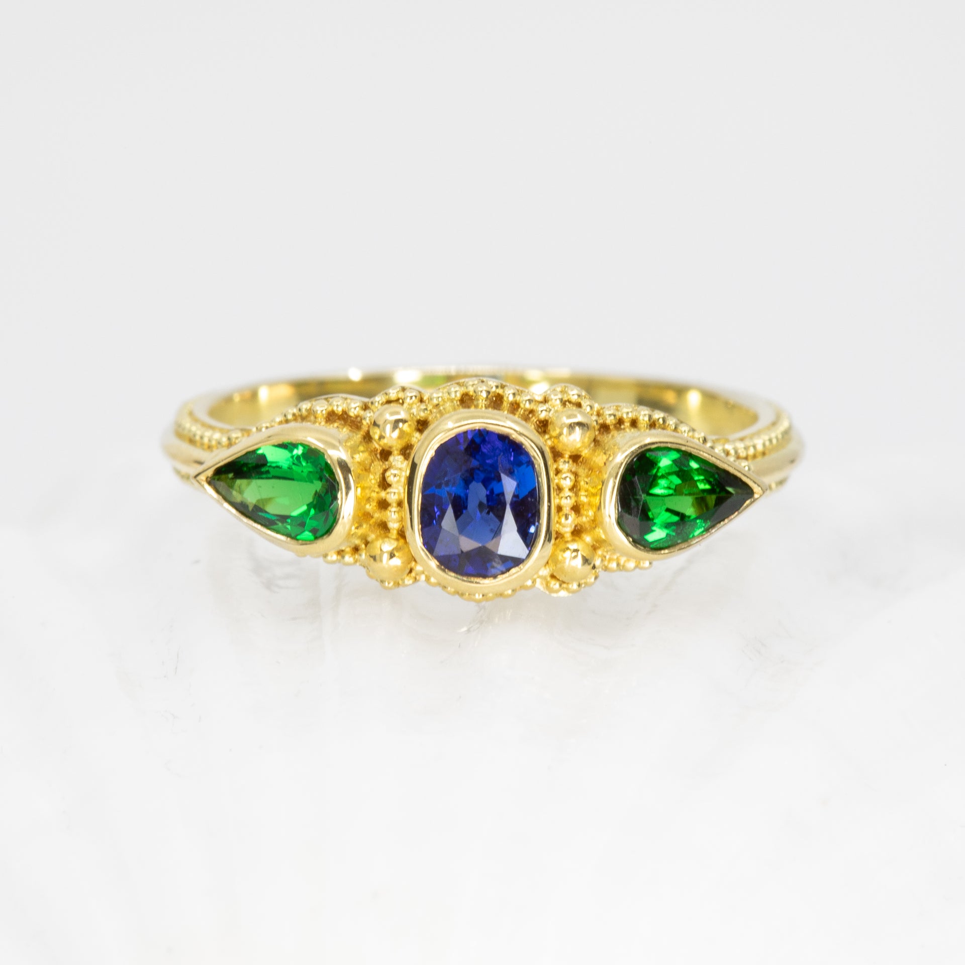 This exquisite ring is a true work of art, handcrafted from 18K gold and accentuated with intricate granulation to add an opulent flair. It is set with a gorgeous royal-blue sapphire and two vibrant-green tsavorite garnets, imbuing it with a regal air that is understated yet captivating.