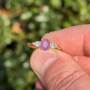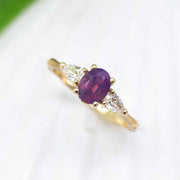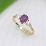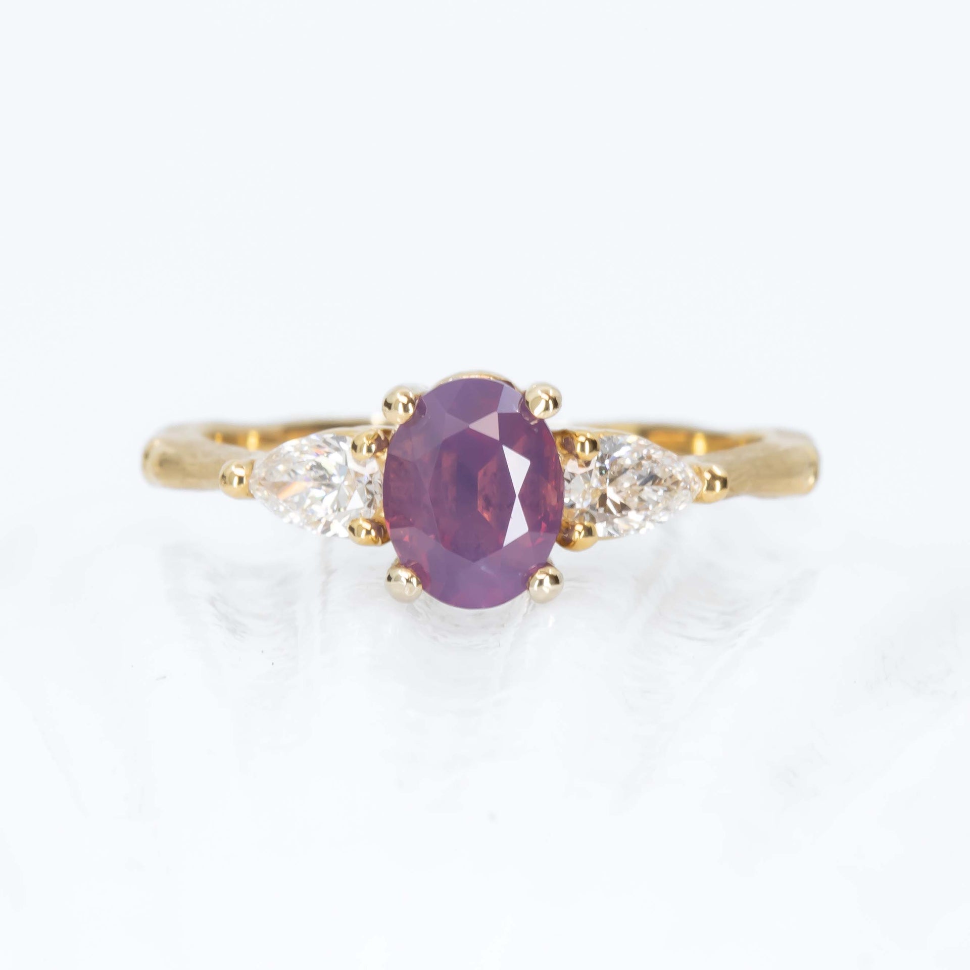 This stunning Bamboo Jewel Ring is a real showstopper! Crafted in 14K gold and holding a beautiful opalescent pink sapphire weighing 1.22cts and flanked on each side by two sparkling pear-cut VS/G-H diamonds weighing 0.32cts in total. This all sits atop a tropical bamboo patterned band for a luxurious and stunning treasure!