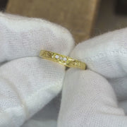 This is a one-off ring I did to experiment with some design options.  Based off my Sapphire Trio Vintage Wave Band, this one features five 1.5mm VS/GH diamonds!  Discover the perfect blend of vintage beauty and modern glamor in this hand-engraved Diamond Trio Vintage Wave Band. Set with 5 beautiful sapphires and crafted by hand in 18K Treasure Gold, made with reclaimed treasure from a sunken 17th-century ship, this stunning ring evokes timeless sophistication and luxurious style.