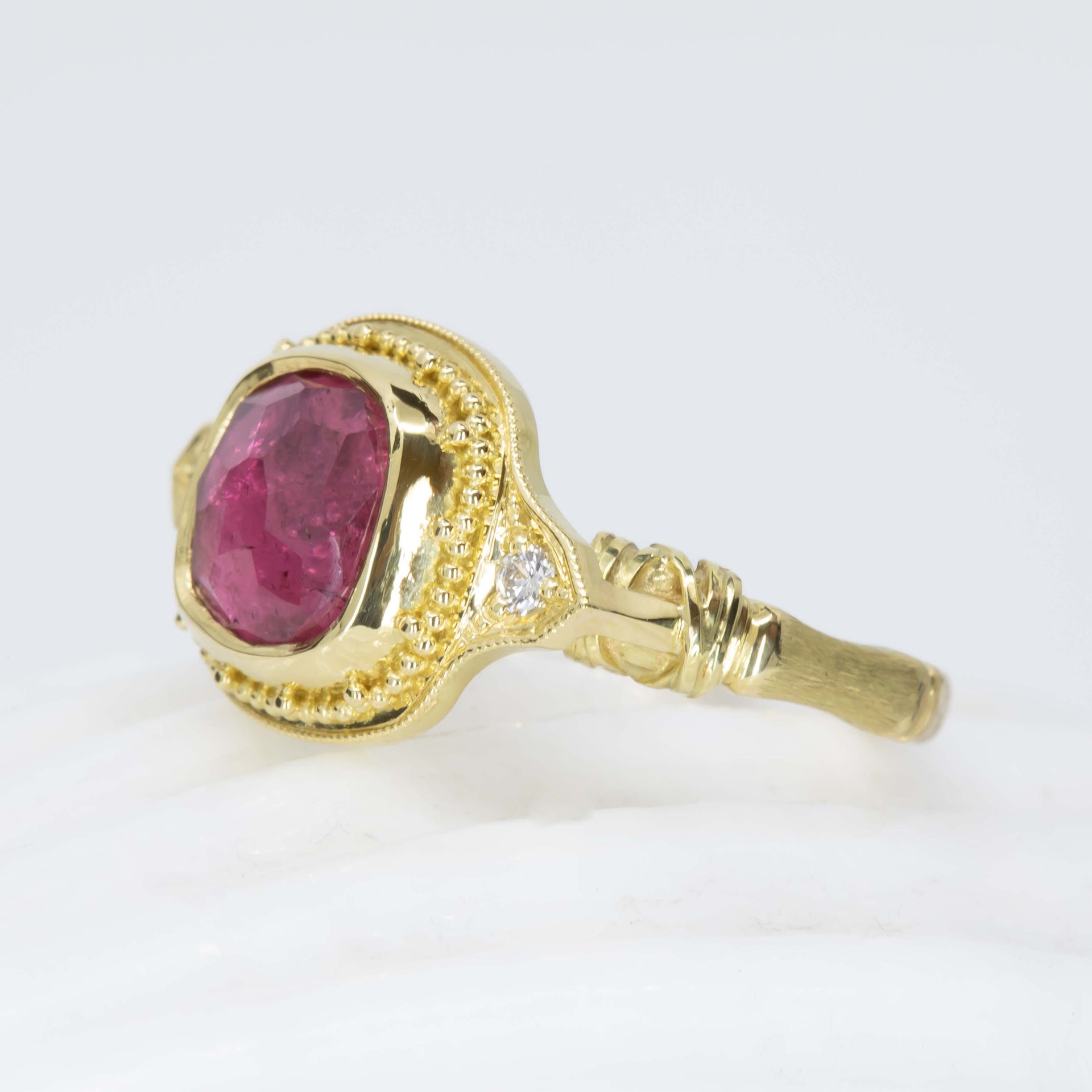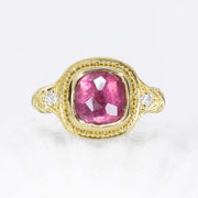Completely handcrafted in my exotic 18K Treasure Gold which is made with 400 year-old sunken treasure recovered from the 1622 wreck of the Atocha in the Caribbean. This tropical-vintage ring is set with a beautiful 2.76ct rose-cut pink tourmaline. The setting is surrounded by Etruscan granulation and then capped off with two sparkling 2mm, VS/G-H diamonds before finally getting an elegant milgrain border.