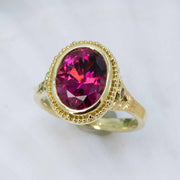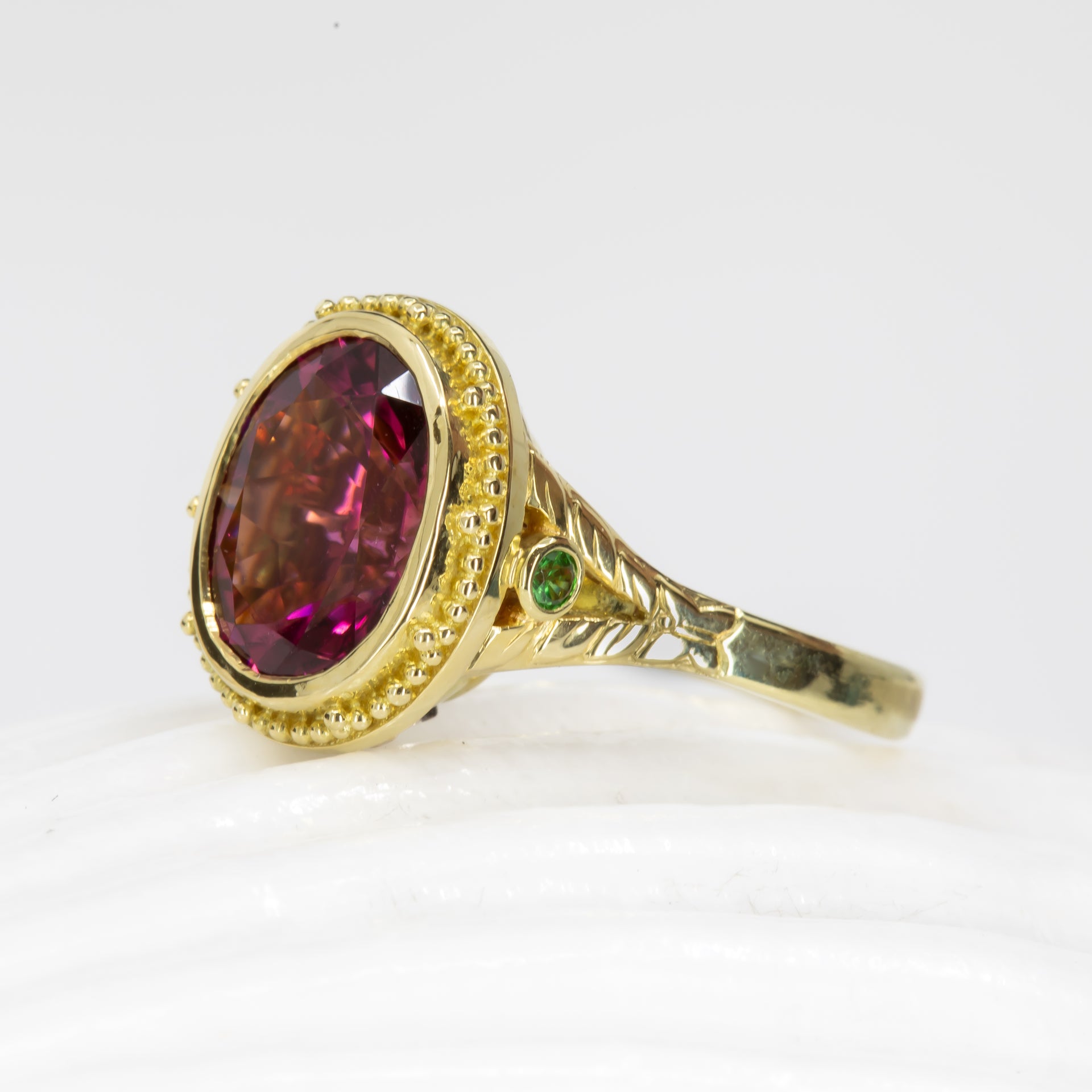 Exquisitely handcrafted in granulated 18KY gold, the “flower” of this one-of-a-kind ring is a 3.13ct rubellite tourmaline. Butterflies created in 18KW and each set with a 1.3mm VS/GH diamond are found on either side of the center gemstone. 2mm tsavorite garnets and the engraved leaf pattern create the flower’s stalk on the shank as engraved butterflies on the shank and beneath the center stone all flutter to the dazzling raspberry-red of the luscious rubellite tourmaline.