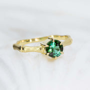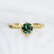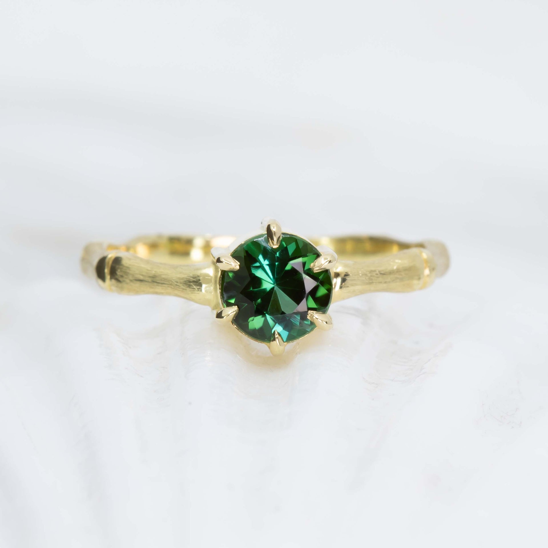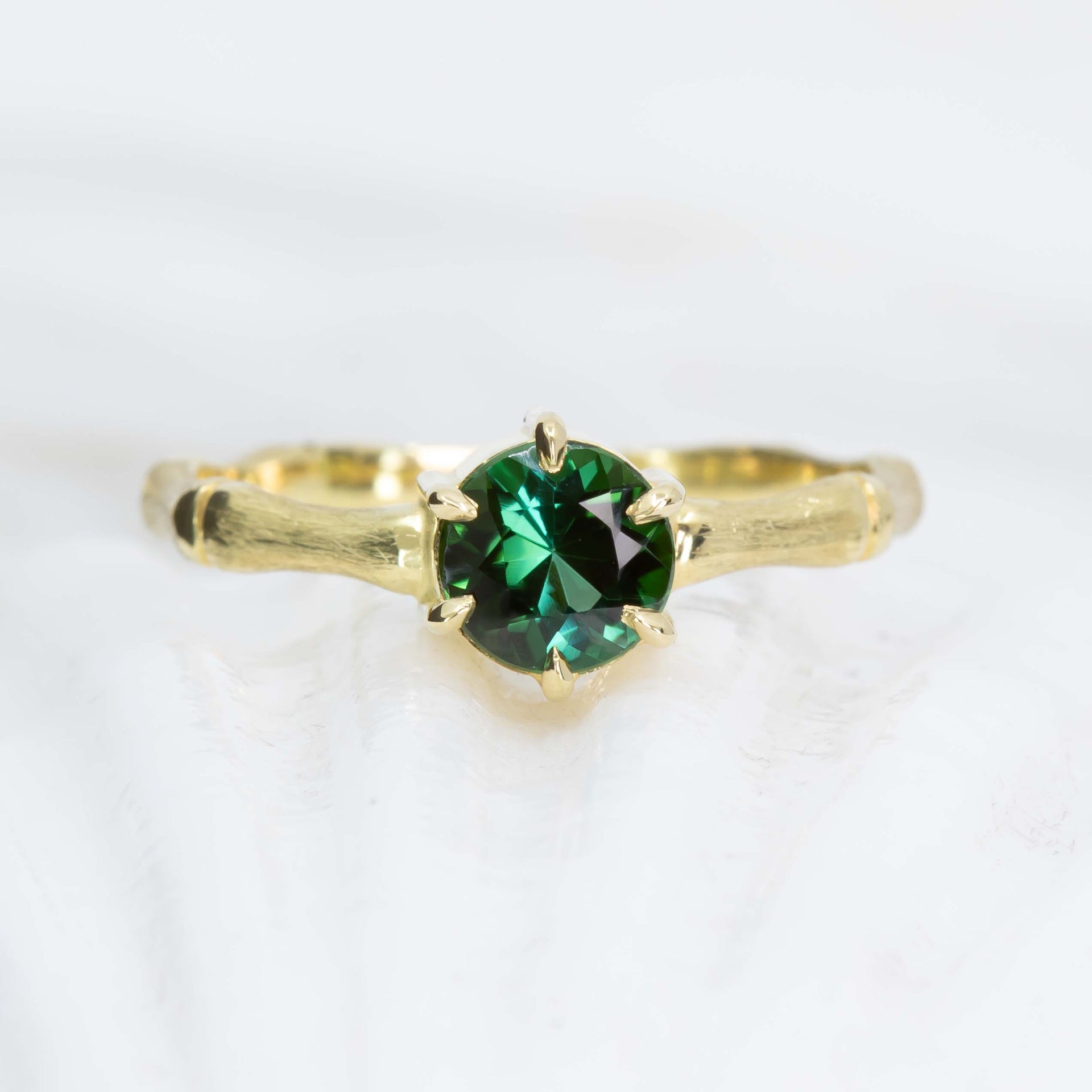 Seven bamboo segments run around the band leading to a center handcrafted setting holding a round, 6mm tropical-green tourmaline (approximately 0.85cts). Completely handcrafted in my exotic 18K Treasure Gold, made with 400 year-old sunken treasure recovered from the Caribbean.