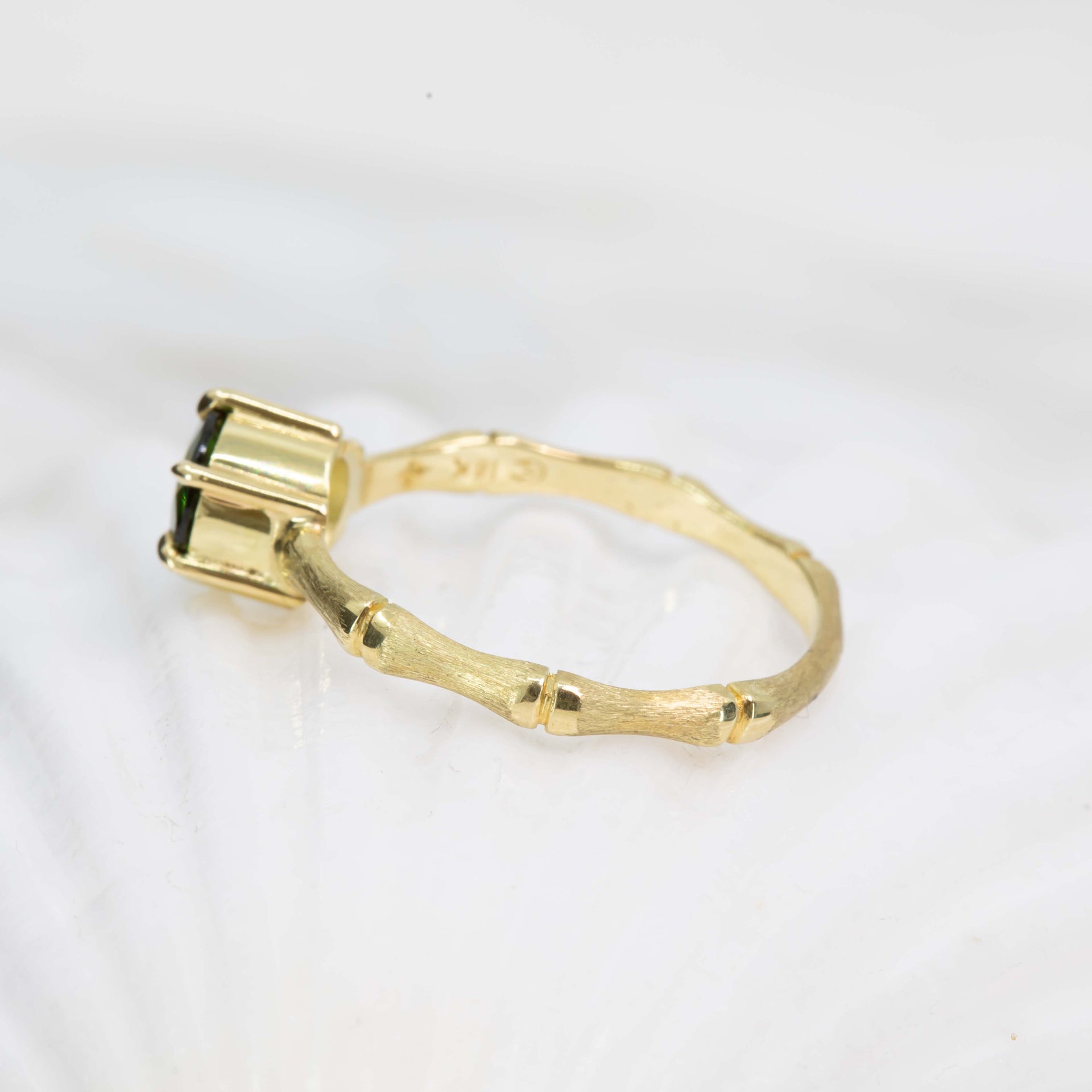 Escape reality with this Green Tourmaline Bamboo Jewel Ring. Featuring a hand-carved bamboo band and a lush green tourmaline, it's been handcrafted with 18K Treasure Gold made from shipwreck treasure for a unique and stunning look. Enjoy the dreamy feel of the tropics with this captivating piece of jewelry.