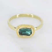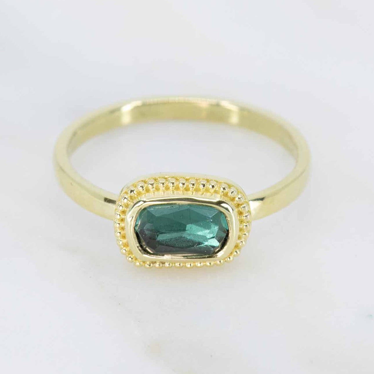 18K Treasure Gold ring set with an irregular rose-cut green tourmaline with a slight blue hue on a 1.75mm wide Water-Ripple patterned band. Handcrafted in solid 18K gold made with 400 year-old sunken treasure recovered from the Caribbean and featuring the ancient Etruscan art of granulation. Current size is 6.75, but each ring comes with free sizing and FREE SHIPPING!
