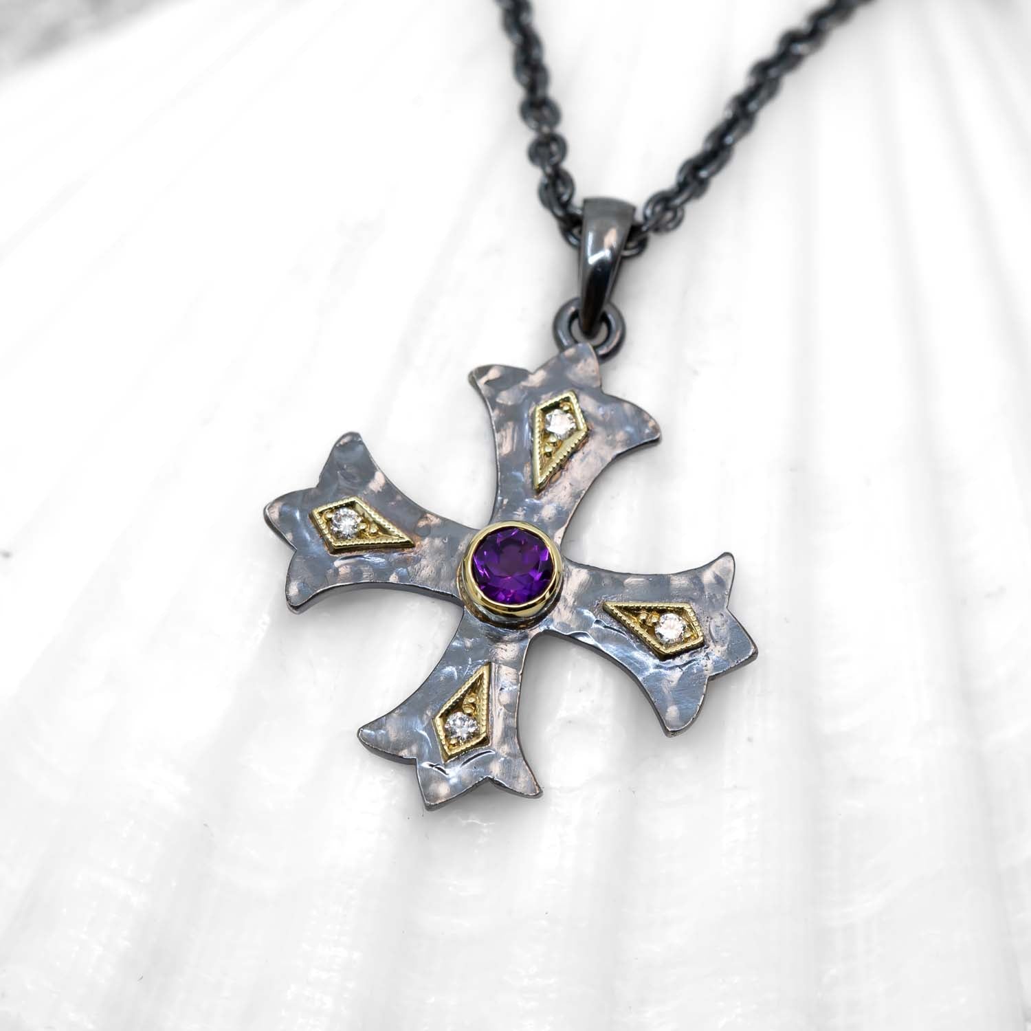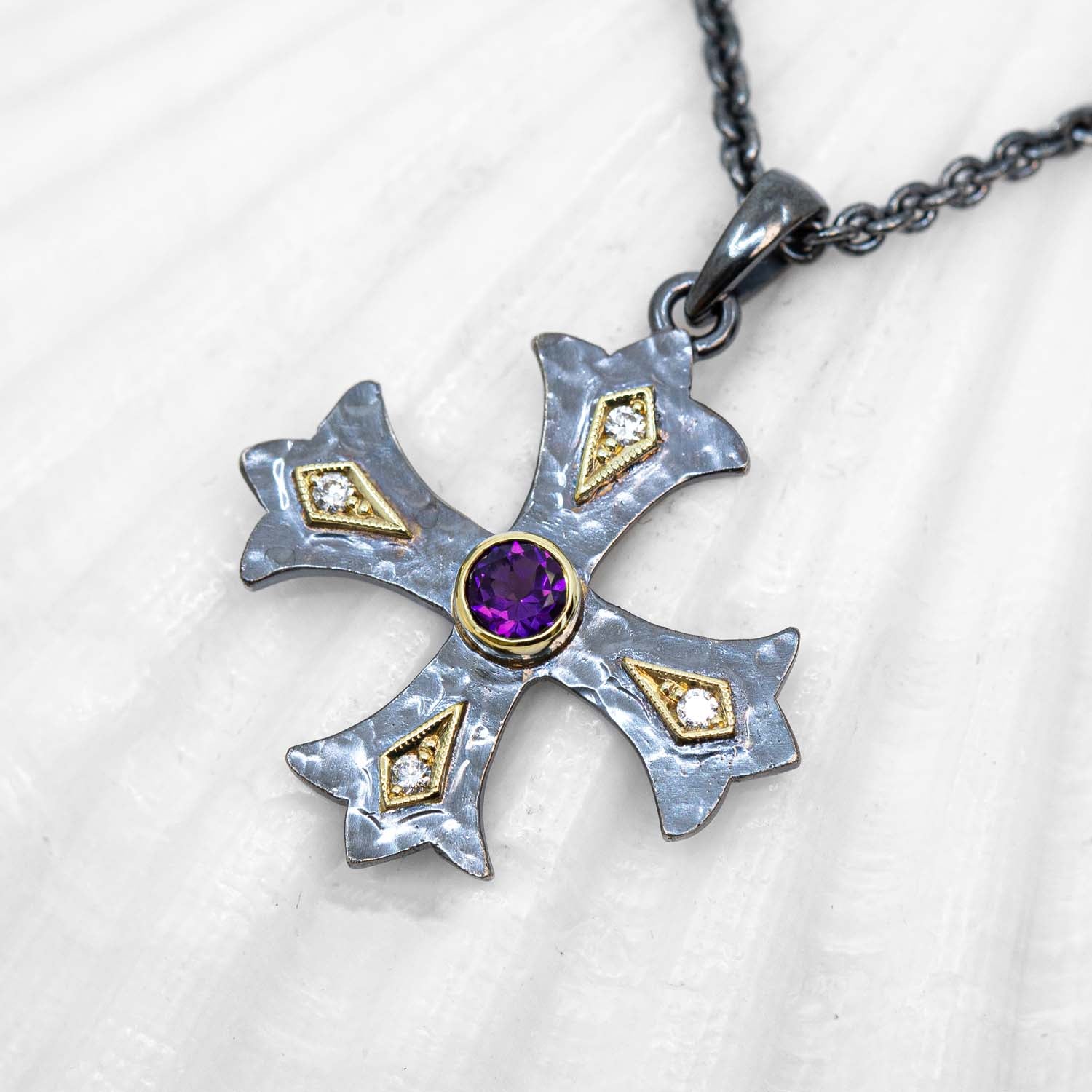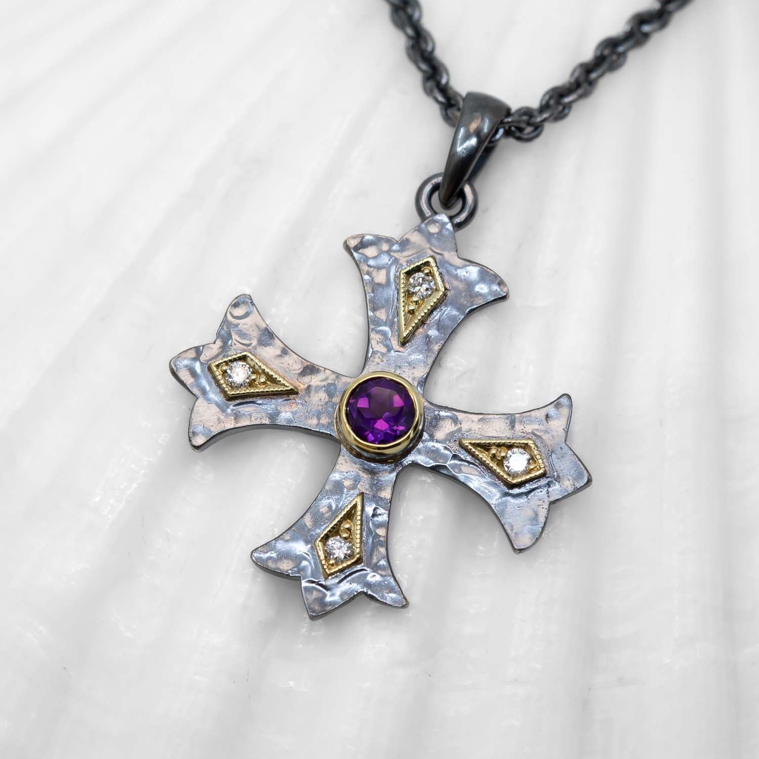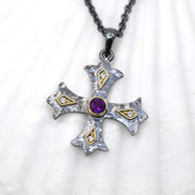 Individually handcrafted in Sterling Fathoms Silver with 18K Treasure Gold settings, the cross was inspired by medieval wrought iron work. This cross is set with a center 0.35ct amethyst and is surrounded by and 4-1.6mm VS/G-H diamonds. (Necklace not included)