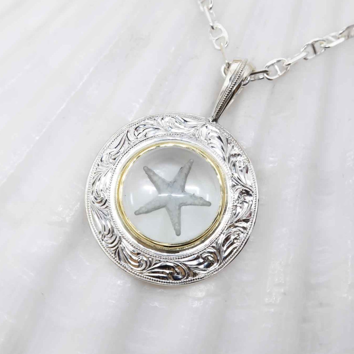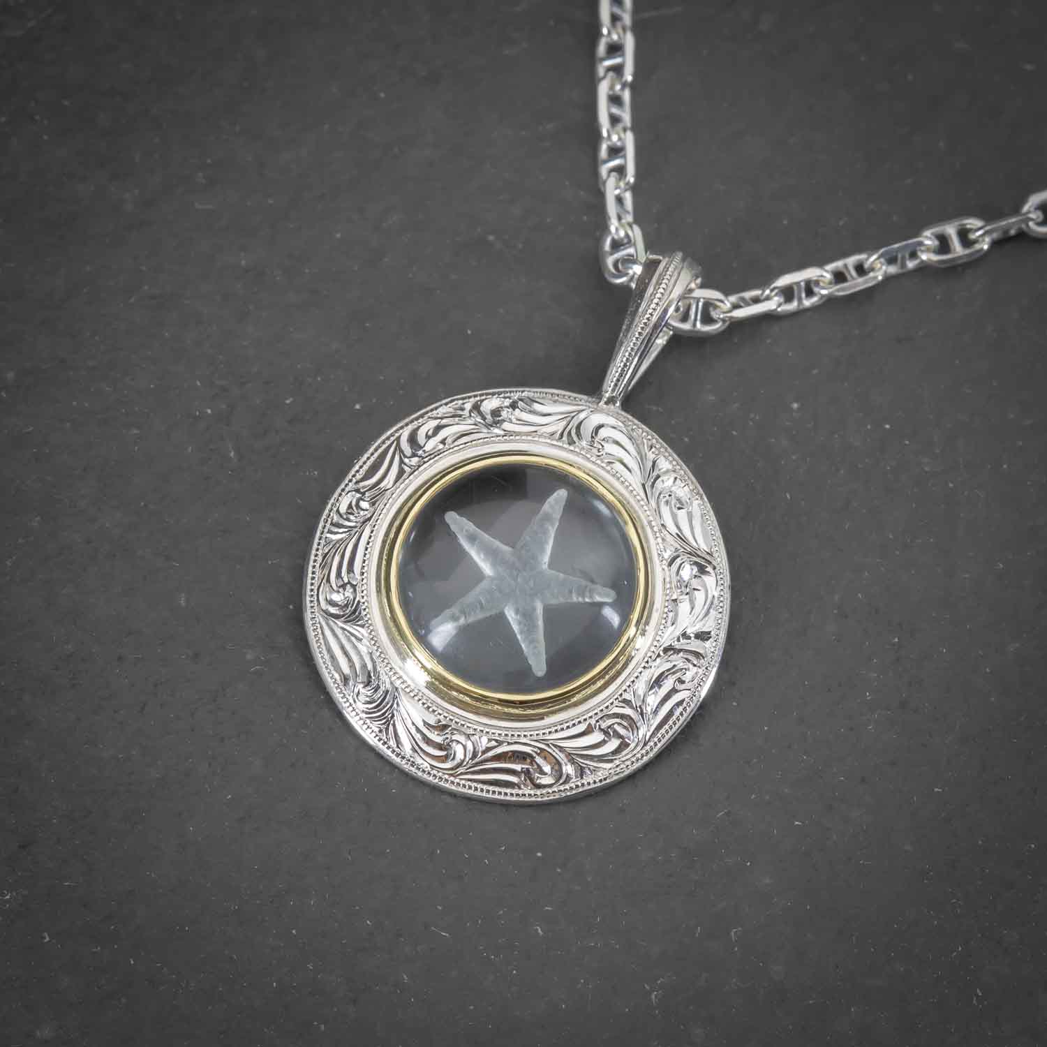 This dazzling Quartz Starfish Pendant is a beautiful way to add a bit of oceanic-flare to your look! Entirely handcrafted, it features a beautiful quartz starfish intaglio set in Sterling Fathoms Silver with an 18K Treasure Gold bezel. The pendant has then been hand-engraved with an intricate vintage-inspired wave pattern and an elegant milgrain border. All of this is then suspended from a nautical 18" sterling silver anchor chain (included!) Wear the beauty of the ocean!