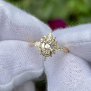 The St. Lucia Ring captures the dramatic beauty and romance of one of the Caribbean’s most iconic destinations. Its 1.24ct vintage-style oval diamond is surrounded by a luminous halo of marquise and round diamonds, bursting outward like sunlight over the island’s lush peaks. Crafted in 14K gold, the shank has a lovely bamboo pattern which flares wider towards the bottom for a truly elegant look. Enjoy the dreamy feel of the tropics with this gorgeous and captivating ring.