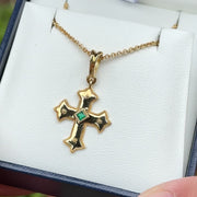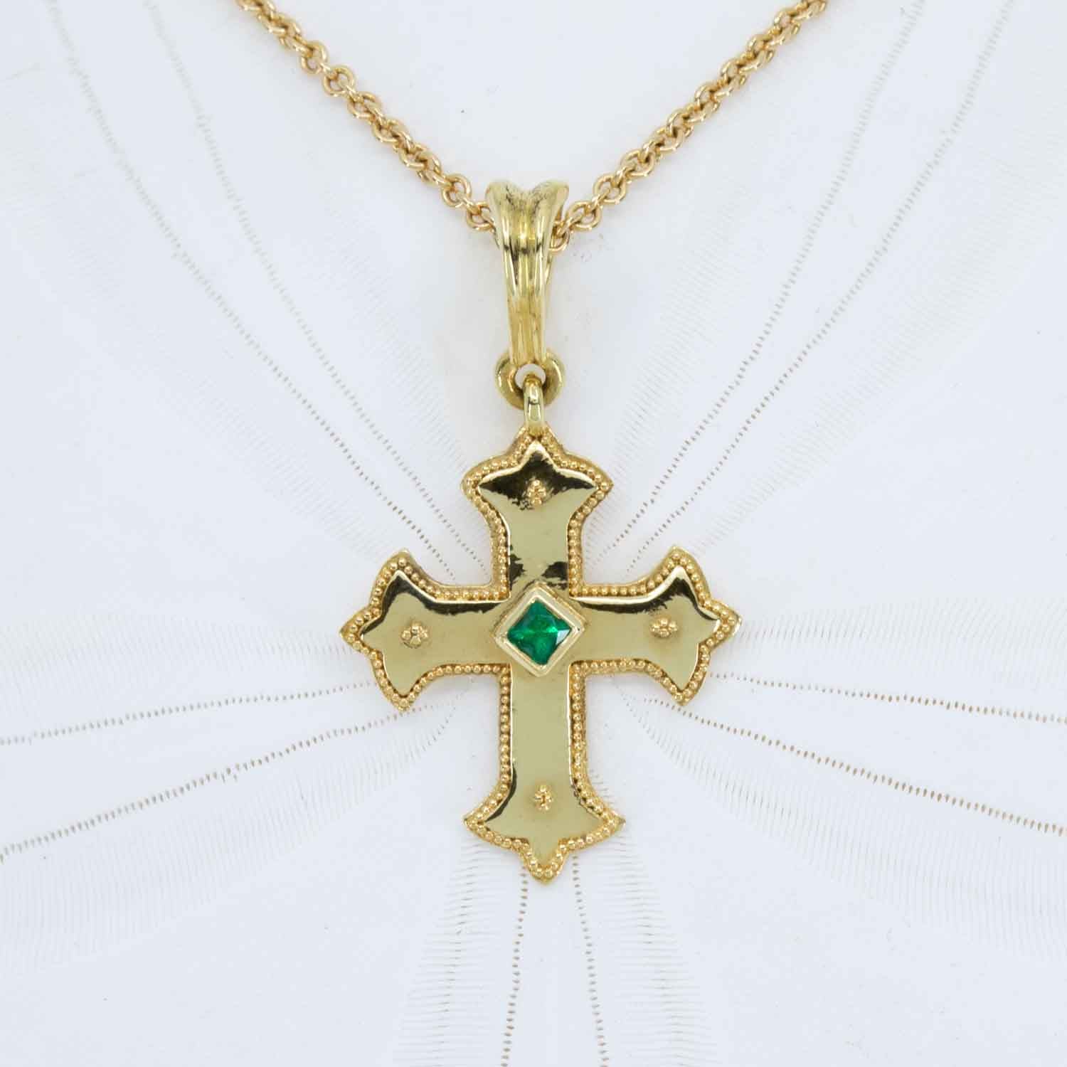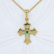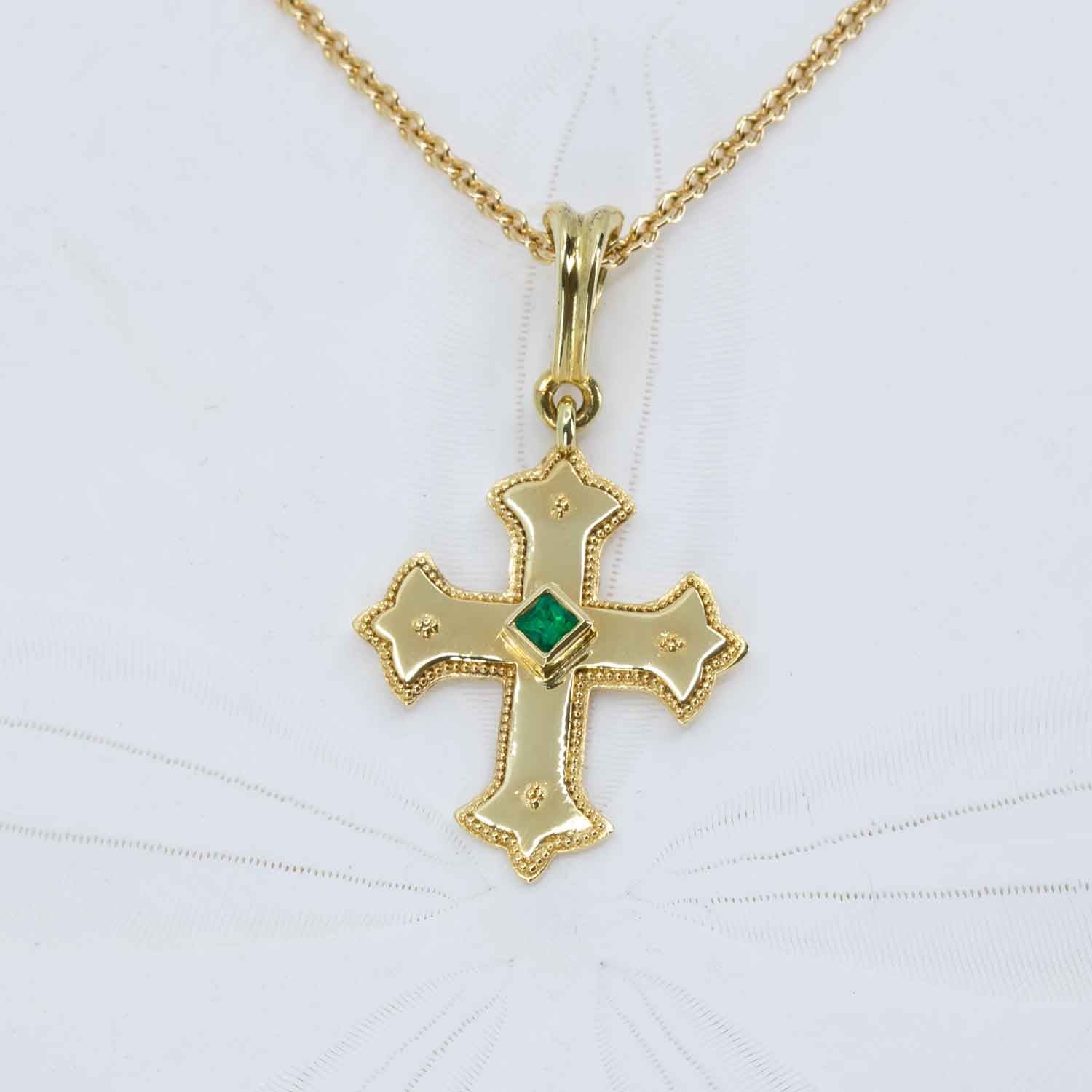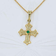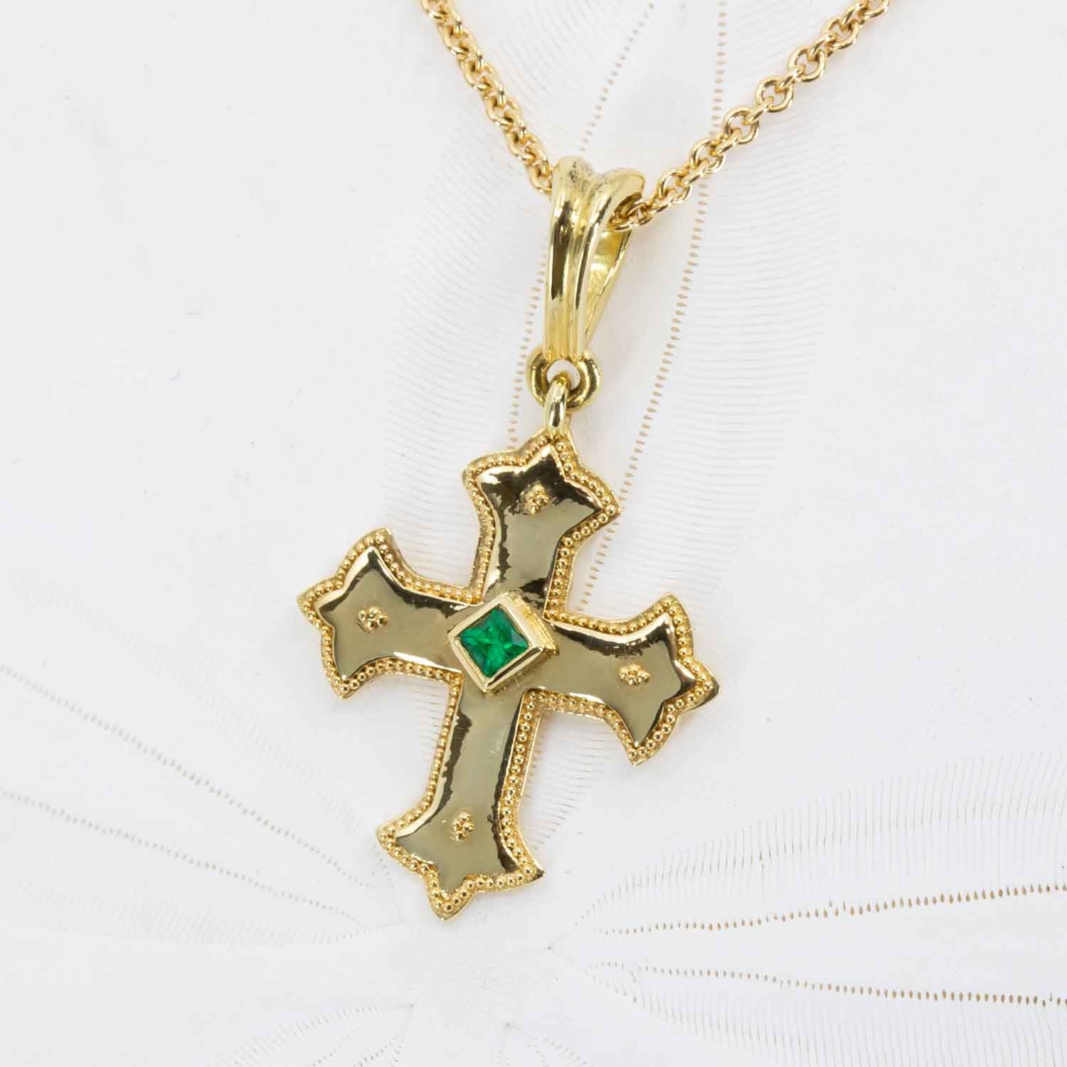 A beautiful mix of grace and style, this 18K granulated gold cross pendant features a 2.5mm princess-cut emerald. A perfect addition to your jewelry collection, it adds timeless beauty to any outfit.