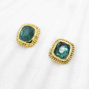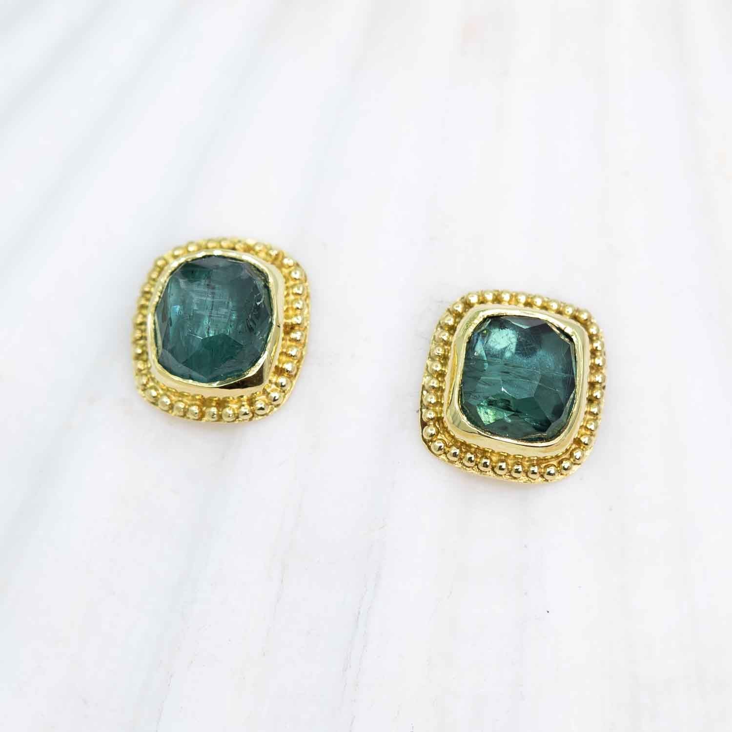 These elegant earring studs feature 2 oceanic blue-green tourmalines (2.16cts) in granulated 18K Treasure Gold. Simple, yet stunning, these earrings are handcrafted and granulated in solid 18K gold made with 400 year-old sunken treasure recovered from the Caribbean.