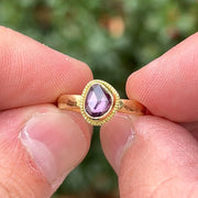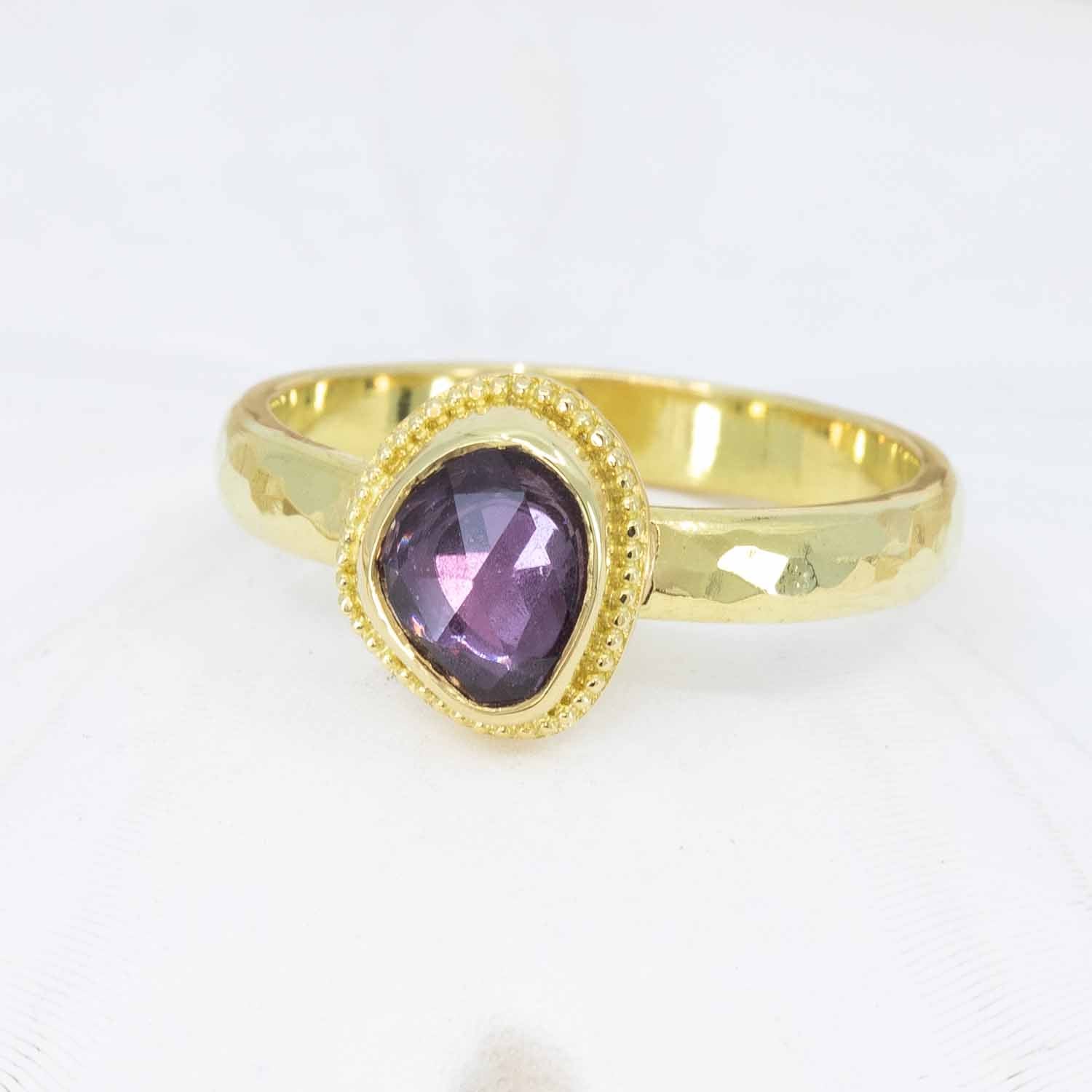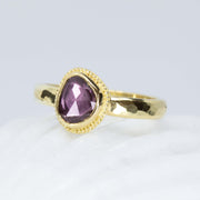 This breathtaking 18K Treasure Gold ring, crafted with sunken treasure, showcases a majestic 1.13ct rose-cut pink sapphire. Enjoy the delightful shimmer of its water-ripple band, while its ancient feel adds a touch of mystery to any outfit.