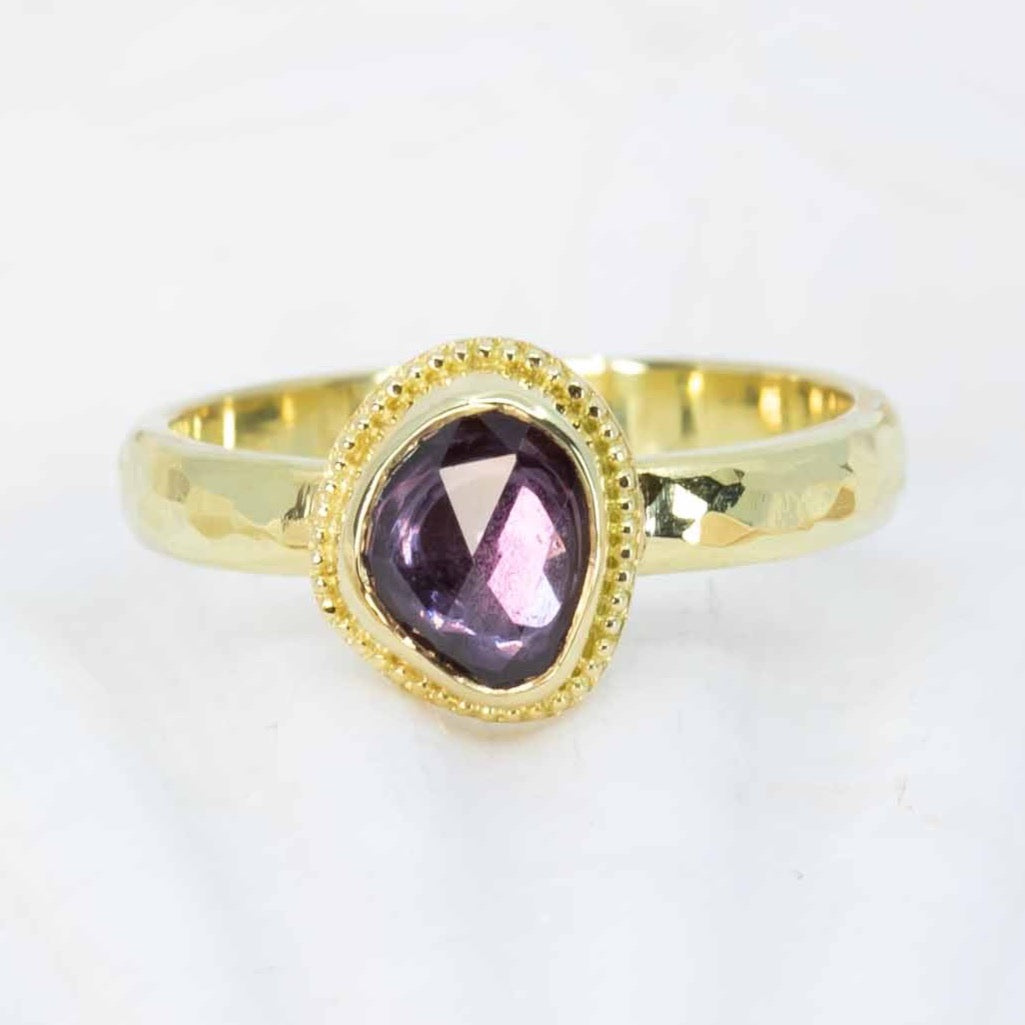 While I can make similar style rings, this one is one-of-a-kind owing to the irregular cut of the gem.  Handcrafted in solid 18K gold made with 400 year-old sunken treasure recovered from the Caribbean.  Size 7.25, but each ring comes with free sizing and FREE SHIPPING!