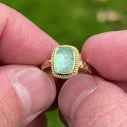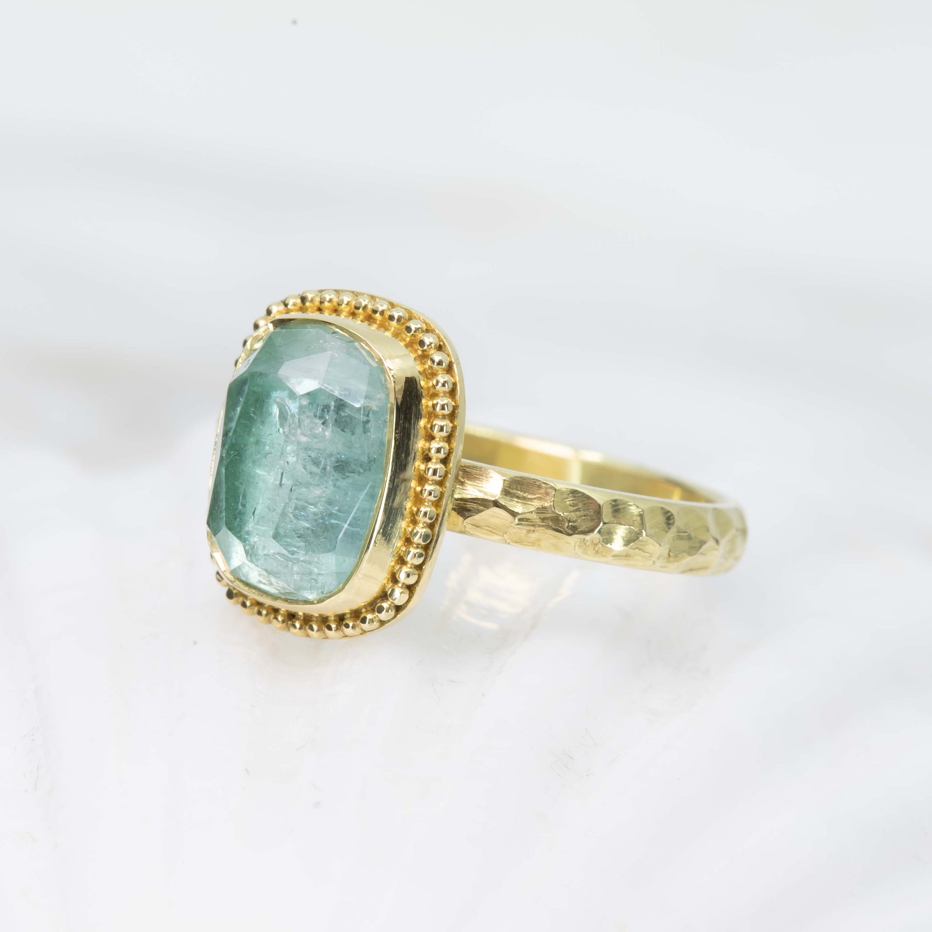 This stunning 18K Treasure Gold ring is set with a breezy-feeling, rose-cut seafoam-green tourmaline (approximately 2.92ct and 9.5mm x 7.5mm) on a 2.5mm wide band with a High Seas Pattern.  Handcrafted in solid 18K gold made with 400 year-old sunken treasure recovered from the Caribbean and featuring the ancient Etruscan art of granulation, the current size is 6.5, but each ring comes with FREE sizing and FREE SHIPPING!