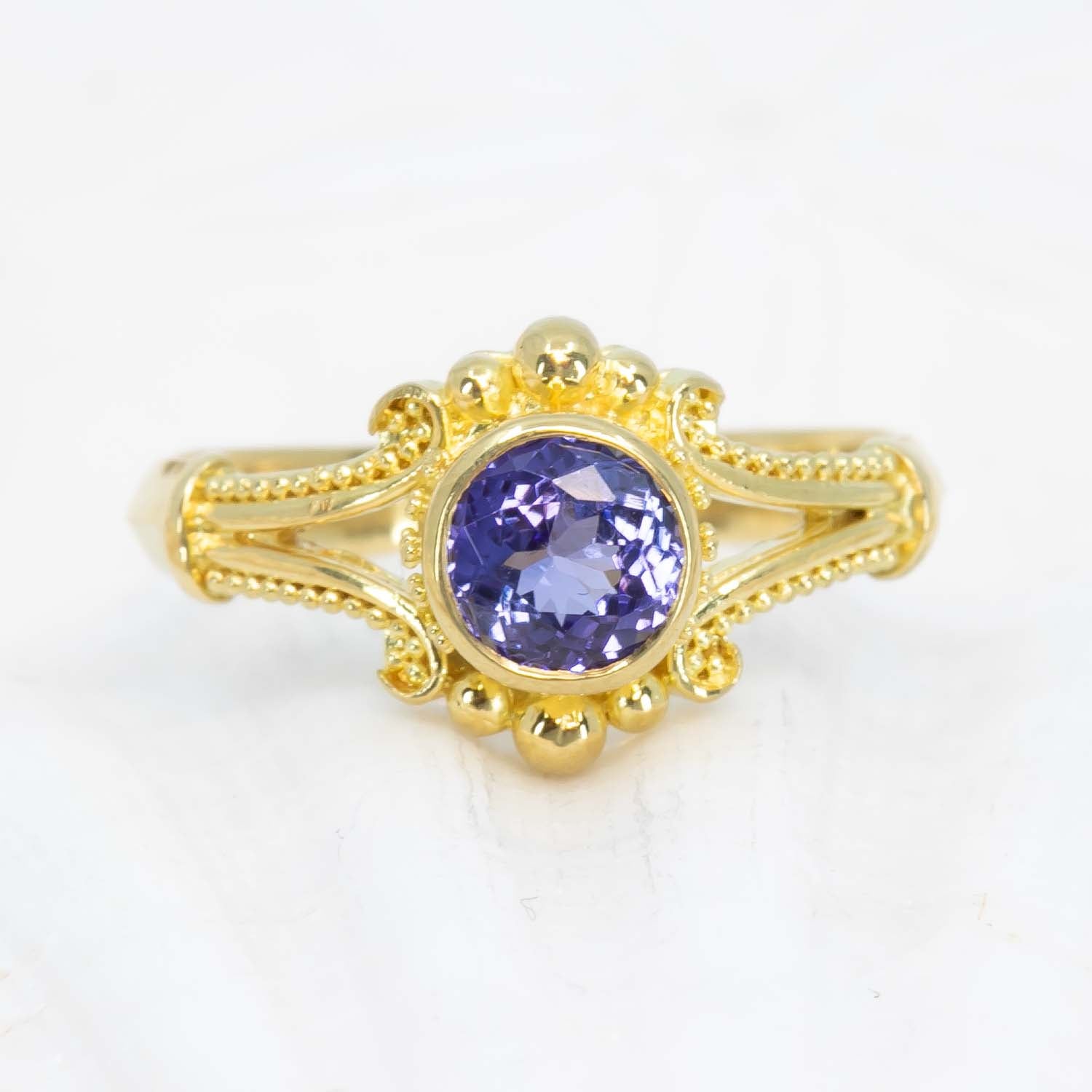 Unleash your inner classic beauty with this Tanzanite Classical Ring, a luxurious 18K gold piece featuring intricate Etruscan granulation and a lovely 6mm tanzanite. Enjoy wearing this gorgeous ring for any occasion.